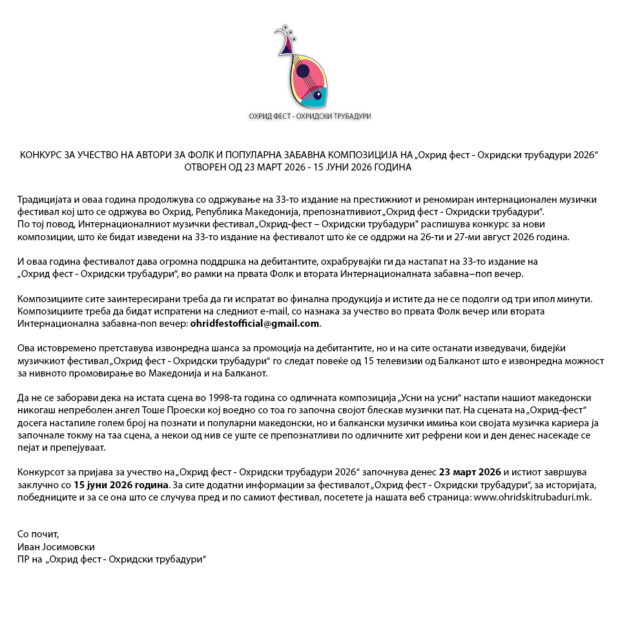 Охрид и ова лето ќе пулсира во ритамот на музиката. Традицијата продолжува – отворен е конкурсот за 33-тото издание на интернационалниот музички фестивал „Охрид Фест – Охридски трубадури“, еден од најпрепознатливите музички настани во регионот. Фестивалот ќе се одржи на 26 и 27 август 2026 година, а организаторите повторно ги повикуваат сите креативци, изведувачи и автори да испратат свои нови композиции и да станат дел од сцената која со години создава музички приказни.
